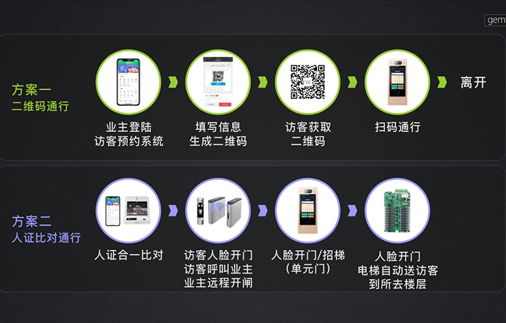 優(yōu)化體驗(yàn):訪客可通過業(yè)主所發(fā)二維碼無感通行社區(qū)出入口、單元樓門口,亦可通過人臉識(shí)別道閘呼叫業(yè)主開閘,實(shí)現(xiàn)無感通行社區(qū)出入口、單元樓門口,人臉招梯至業(yè)主所在樓層。