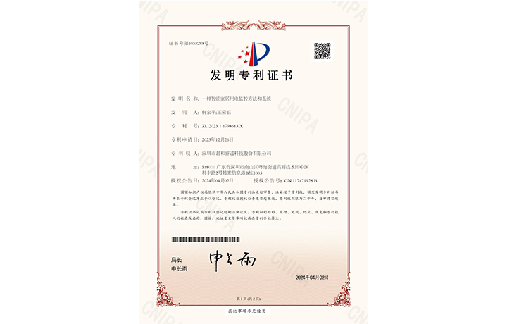 堅朗君和獲得“一種智能家居用電監(jiān)控方法和系統(tǒng)”的發(fā)明專利證書是堅朗君和研發(fā)實力的驗證,更是對公司在智能用電監(jiān)控技術(shù)方面的深度探索和創(chuàng)新能力的肯定,使公司在智能家居及安全用電領(lǐng)域的品牌影響力大大提升。隨著智能用電技術(shù)的不斷普及和應(yīng)用,相信未來我們的生活將會變得更加智能、便捷、安全和舒適。